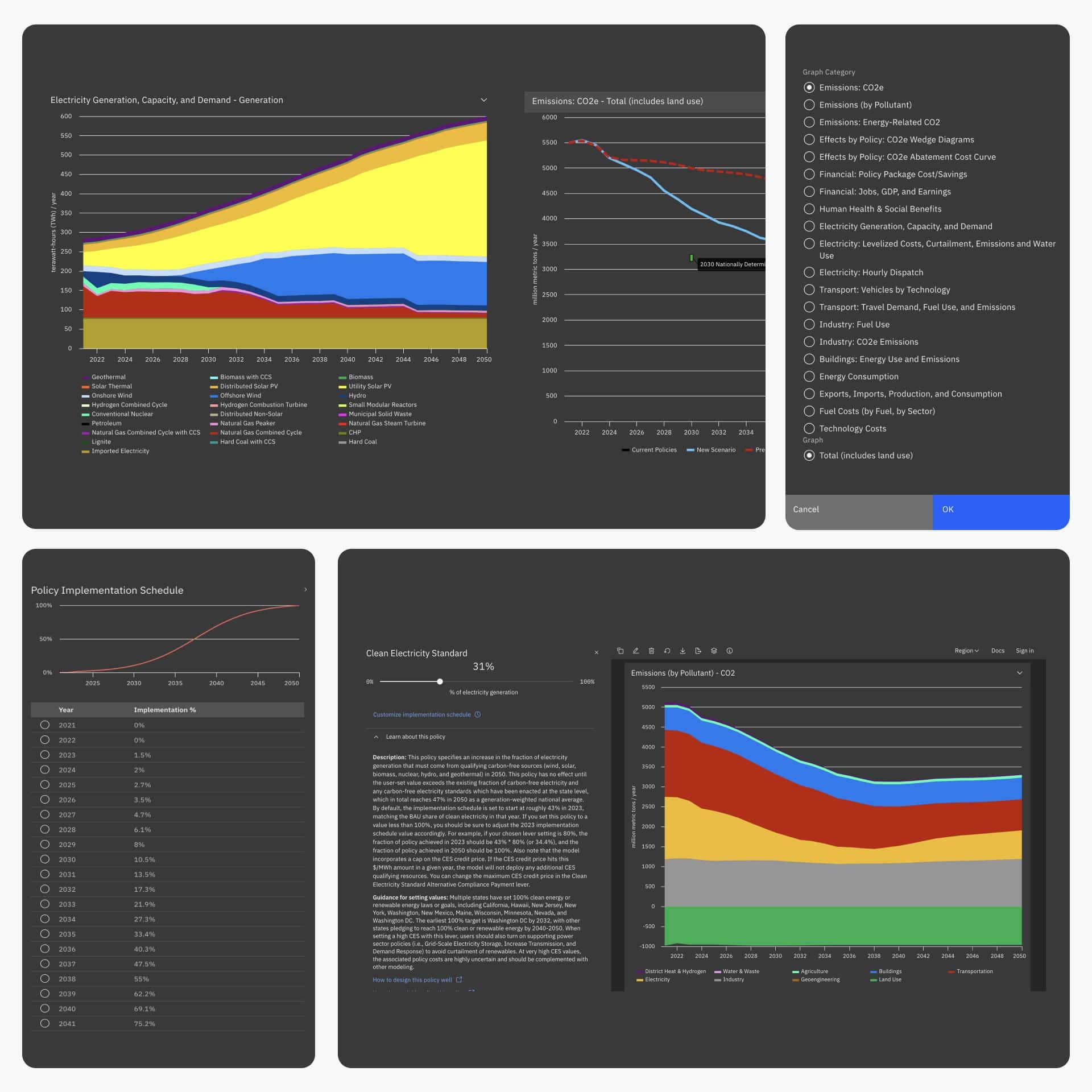 Evaluate multiple policies to visualize economic growth, emissions reductions, health benefits, and more.