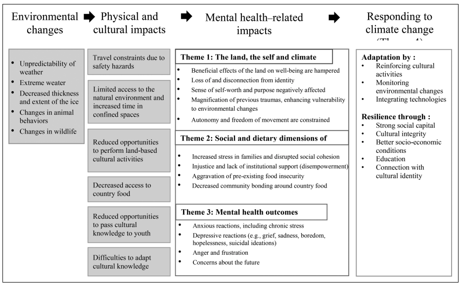 Similar trends emerge in a 2022 review article by Lebel and colleagues about climate change-associated mental health impacts and responses among Indigenous peoples in the Circumpolar North. Climate change-driven disturbances to land, food availability, mobility, and associated cultural practices have eroded mental well-being and triggered the reemergence of past trauma (Figure 2).