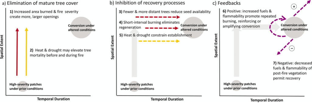 These dynamics all culminate in what ecologists refer to as conversion – a transformation into a new ecological state, with new dominant species, usually filling different ecological functions. The conversion of a forest to a non-forest may happen as the result of a single large, high-severity fire, or it may happen as the result of post-fire conditions that make the burned area more likely to burn again before forest regeneration can occur (Figure 2).