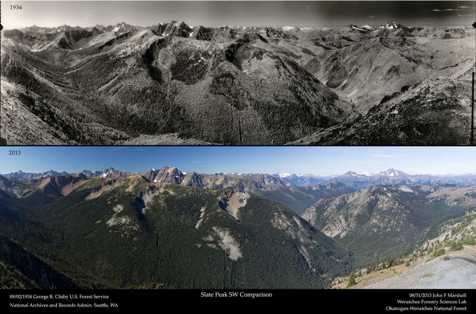 Figure 1. Top photo: View from atop Slate Peak in northeastern Washington, looking southwest, 1934, George Clisby photograph, National Archives, Seattle, Washington, USA. The 1934 panoramic view shows extensive evidence of prior wildfires, varied age classes of cold forest, and recently burned and recovering areas. In the same view nearly eight decades later (bottom photo, 2013, John Marshall Photography), note the complete absence of recent fire evidence, widespread ingrowth creating denser forests, loss of nonforest, and lack of forest successional heterogeneity. Source: Hessburg et al. 2021.