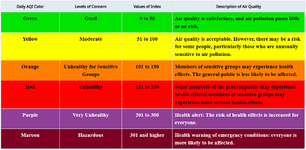 Air quality levels are communicated to the public through the Air Quality Index (AQI). The AQI is a numerical scale that gives an easy read of air quality with colors and corresponding categories ranging from “Good” to “Hazardous,” along with health recommendations to help inform decision making (Figure 1). While many people access air quality information on mobile phone weather apps, AQI information for specific locations can also be found at AirNow.gov, which pools data reported from federal and state-run monitors. If there is not an EPA-regulated air monitor in a specific area, the air quality of the nearest location will be displayed. The EPA’s fire and smoke map is also available on the AirNow site during wildfire season. This map includes additional monitoring sites, information on fire location, and smoke predictions per region.