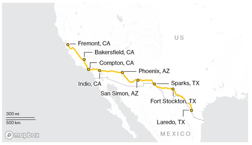 Development of a West Coast electric trucking corridor along the I-5 interstate from San Diego to British Columbia began in 2020. Recently, Tesla proposed a high speed truck charging corridor connecting the south Texas border (Laredo) with northern California (Freemont in the Bay Area) leveraging inflation reduction act incentives.