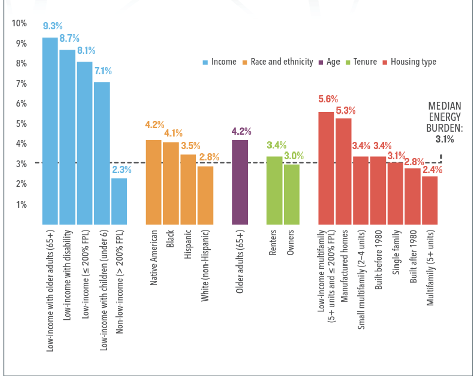 The report also illustrates the disproportionate distribution of energy burden by income level, race and ethnicity, age, and housing type. Inequities in energy burden are shouldered by low-income households (even more pronounced among low-income seniors and those with disabilities); Native American, Black, and Hispanic households; renters; and low-income multifamily housing units and manufactured homes (both of which have notoriously poor weatherization) (Figure 2).