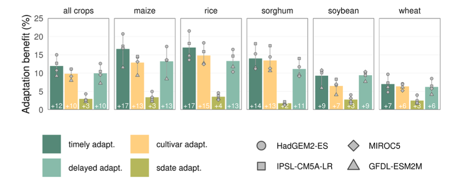 Including these parameters in crop models is critical because they can drastically change yield scenarios. Figure 3 shows the benefits to global yield when adaptation strategies are used. “All crops saw increased yields with adaptation strategies and the highest yields were seen when both sowing and cultivar adaptation are combined (except for wheat).”
