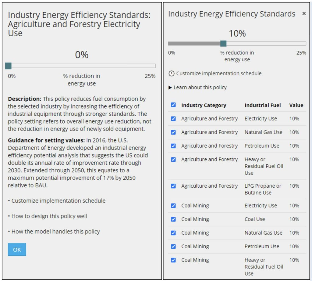 EPS 3.3 includes an updated user interface to set policies across multiple subscripted elements at once. This is a significant improvement for industrial sector policies because it allows the user to toggle more than 20 subscripted industry sectors at once, rather than setting each individually.
