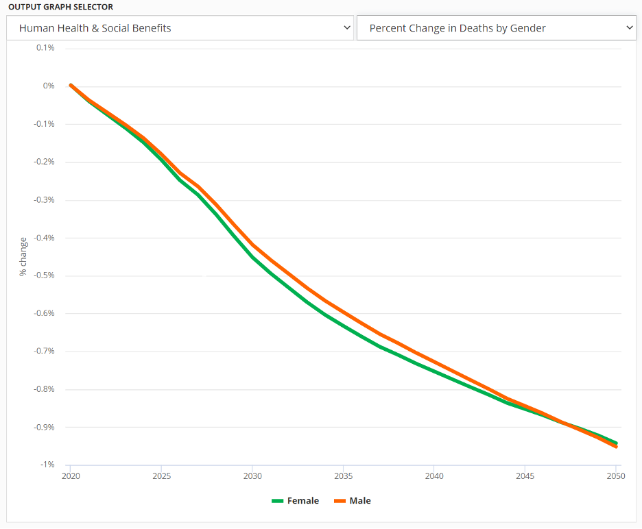 The EPS version 3.3 expands on the model’s existing public health outputs to disaggregate premature deaths by demographic group. The previously released EPS version 3.2.1 reports public health impacts including changes in lost workdays, premature mortality, hospital admissions, heart attacks, and asthma attacks. The newly released EPS 3.3 builds on these metrics by incorporating data from the U.S. Environmental Protection Agency’s (EPAs) Co-Benefits Risk Assessment Health Impacts Screening and Mapping Tool (COBRA tool) to identify changes in premature mortality by gender and race. Premature mortality results are presented as the difference in mortality in the policy scenario from the business-as-usual scenario.