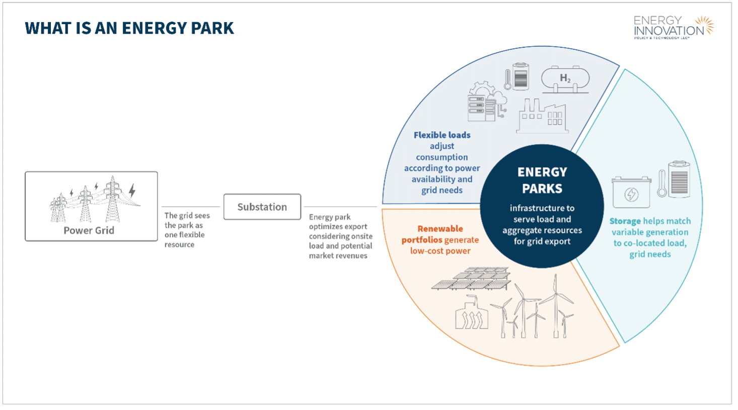 As we seek to clean up our electricity supply and leverage zero-emission electricity to cut climate pollution from buildings, transportation and industry, we need to think outside the box to reach the speed and scale our times demand. This report explores a solution to meet rising electricity demand that can be deployed quickly and affordably: Energy parks. Energy parks integrate multiple renewable energy source and storage solutions like batteries, and potentially co-locate with electricity consumers such as factories or data centers, all connected to the grid at a single point. They do this to speed up development, share costly onsite infrastructure, and directly connect complementary resources.
